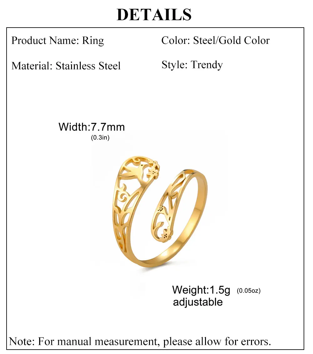 Description: Combine durability with delicate style. This trendy ring is crafted from high-quality stainless steel, ensuring it stands up to daily wear while maintaining its brilliant gold color.