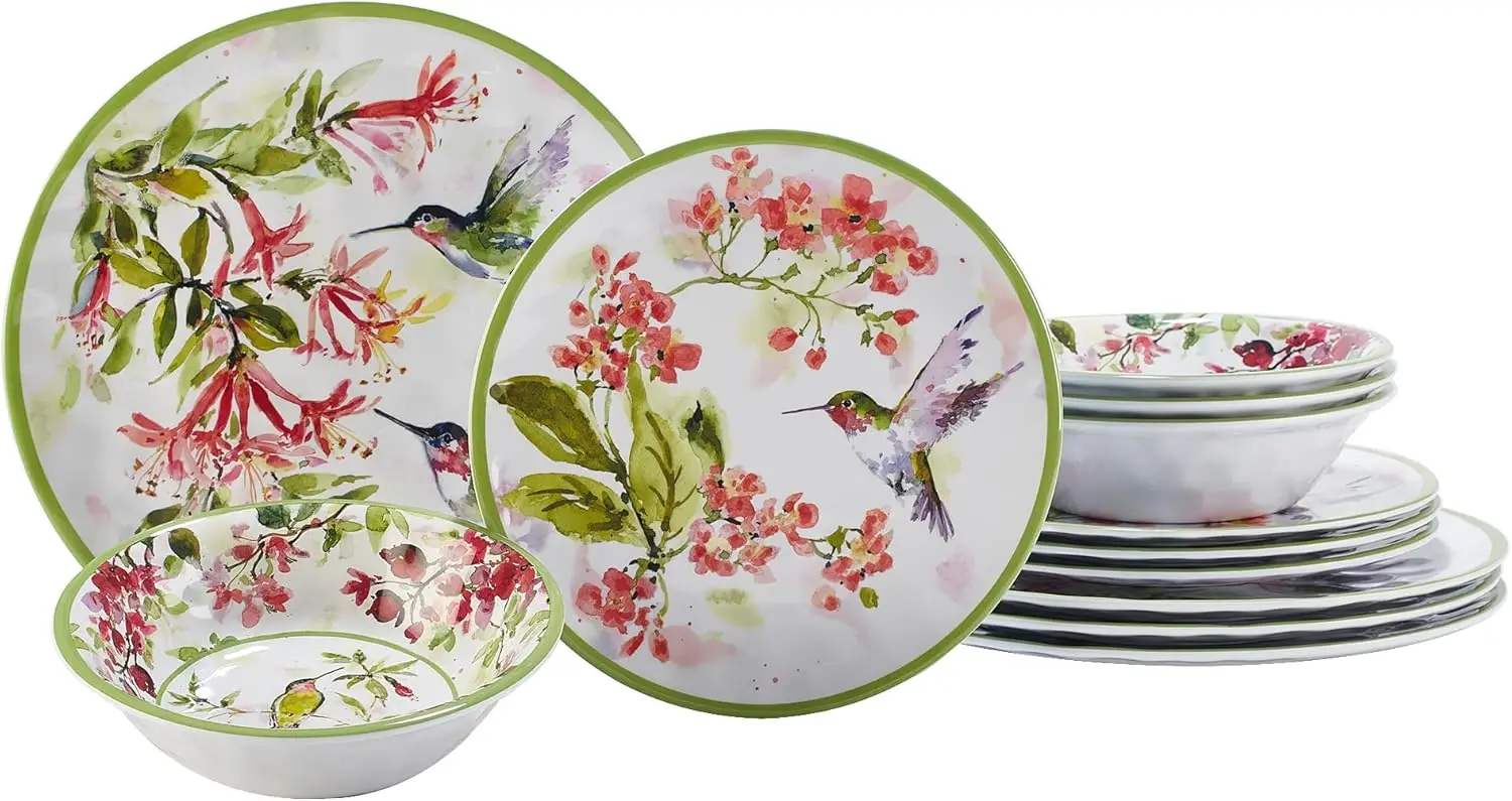 1. Hummingbirds 12-Piece Melamine Dinnerware Set – Service for 4 with Dinner, Salad, and Bowls – Lightweight, Durable, Dishwasher Safe, Floral Hummingbird Design for Indoor & Outdoor Dining